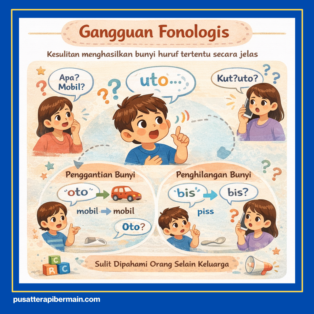 Gangguan fonologis merujuk pada ketidakmampuan anak dalam menghasilkan bunyi huruf tertentu secara sempurna. Suara yang keluar sering terdengar tidak jelas karena adanya penggantian atau penghilangan huruf konsonan saat bicara. Kondisi ini bisa membuat orang di luar lingkungan keluarga merasa kesulitan memahami maksud yang diucapkan Si Kecil.Â